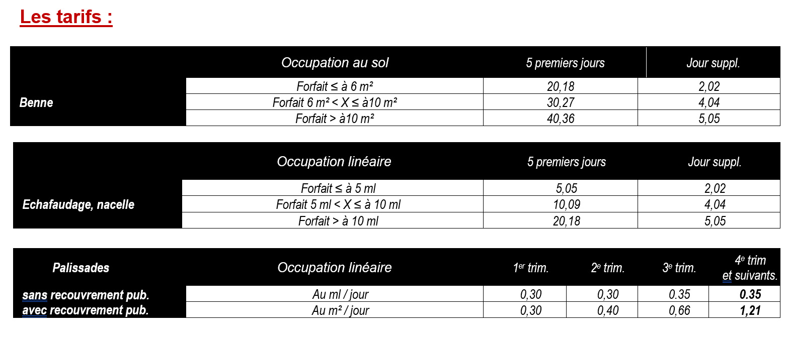 - mais l'occupation du domaine public par une benne, un échafaudage, une nacelle, une palissade, etc. est payante (délibération du conseil municipal du 16 avril 2024) :