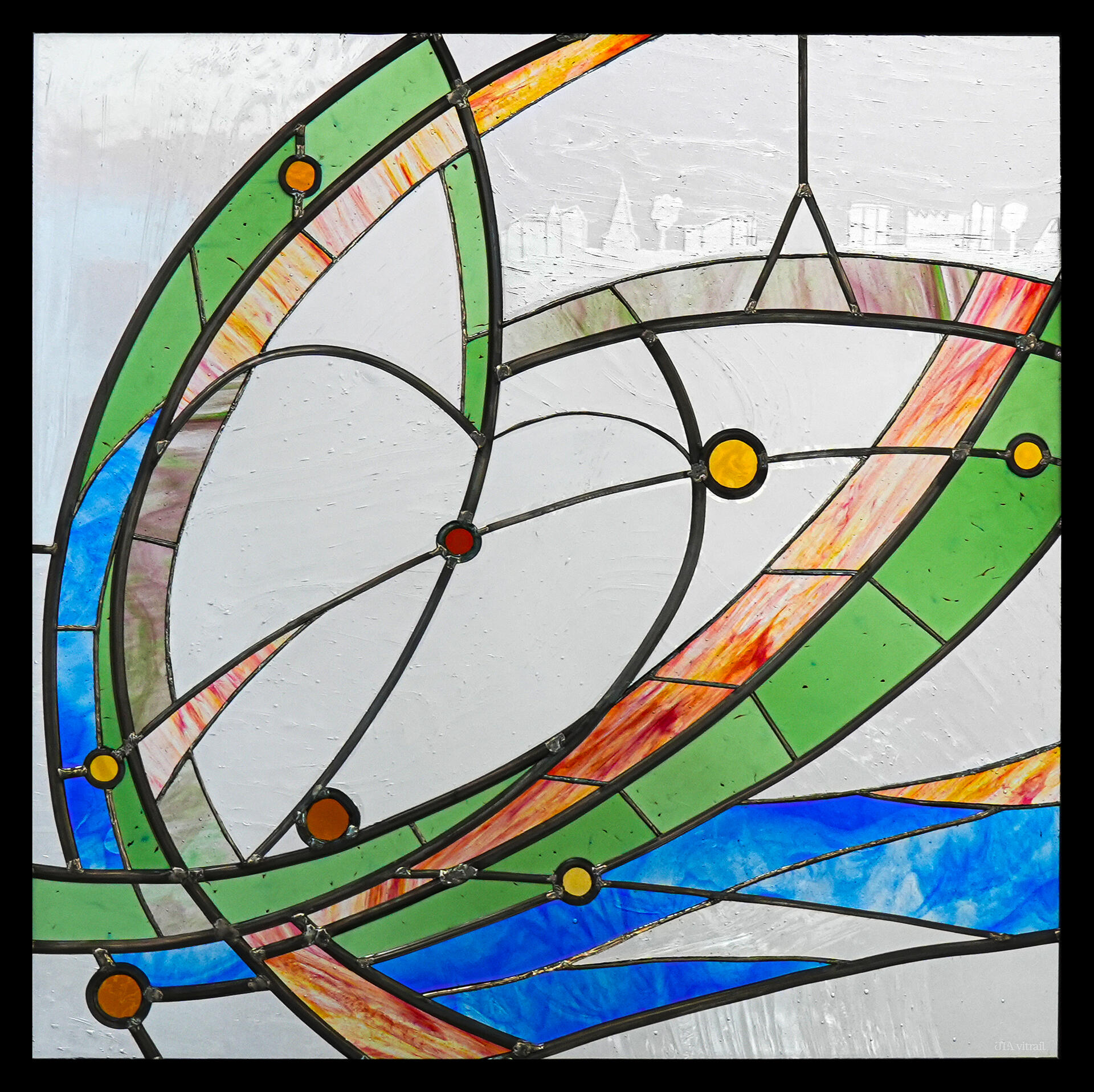 - Les habitants : huit ronds jaunes représentent les participants, chacun ayant gravé son initiale sur sa propre pièce de verre pour signer l’œuvre.