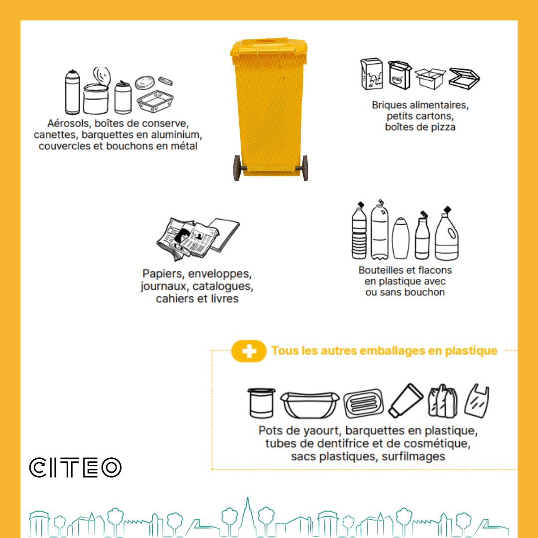 Chez vous, comme dans l’espace public, les déchets suivants sont à jeter dans les contenants appropriés : bac à couvercle jaune, sac jaune ou partie jaune des corbeilles bi-flux.