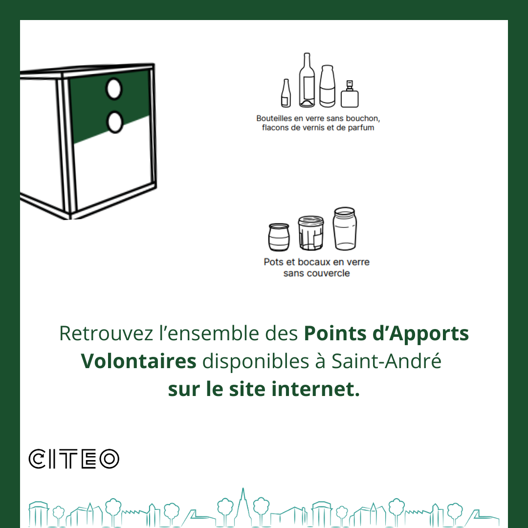 Le verre (bouteilles ou bocaux) est à déposer dans un PAV. Ces emballages sont à jeter sans bouchon ni couvercle, qui eux, vont dans les containers jaunes. Vitrage et vaisselle ne sont pas concernés (à mettre en déchetterie ou dans le bac gris).