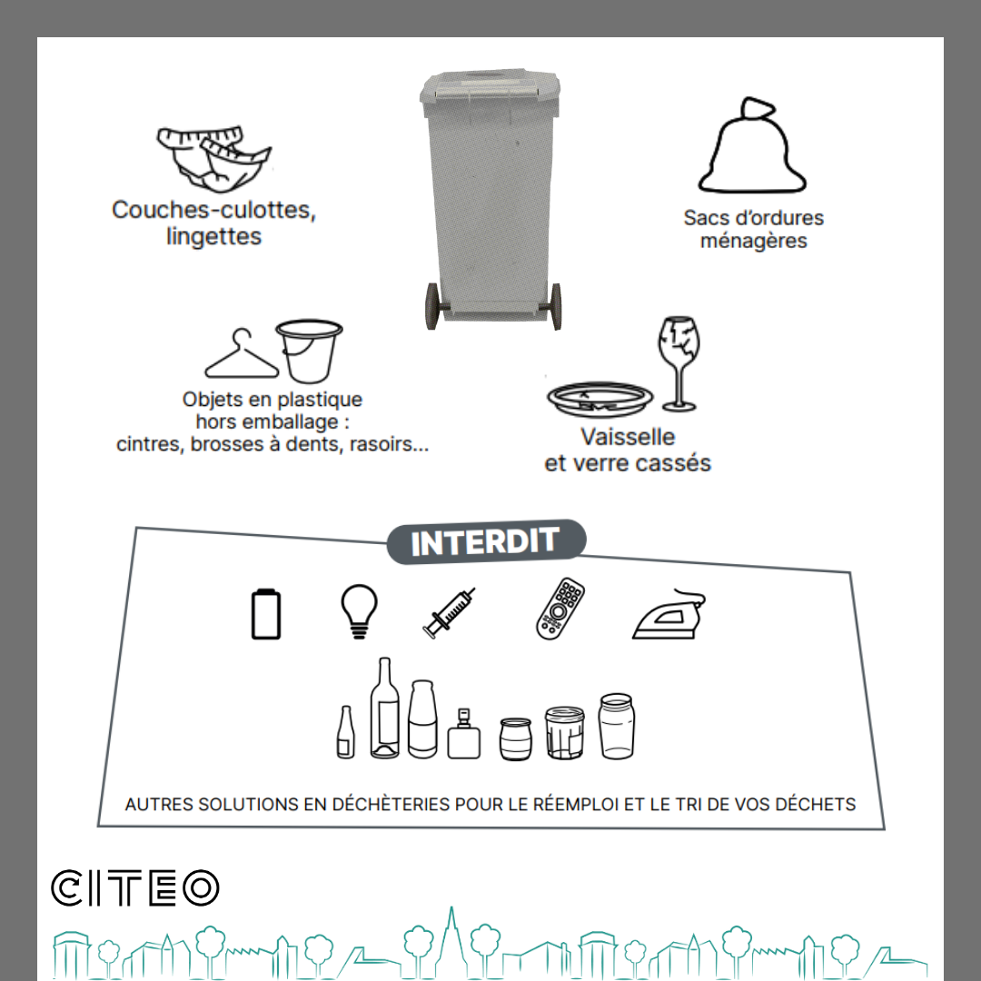 Les couches-culottes, lingettes, objets en plastiques hors emballage (cintres, brosses à dents, rasoirs...) vaisselles et verres cassés, sac d'ordures ménagères sont à déposer dans les poubelles d'ordures ménagères (poubelles grises).