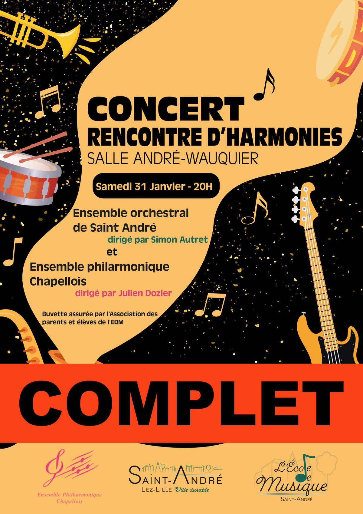 Ne manquez pas le concert-rencontre d’harmonies qui croise les notes de l’Ensemble orchestral de Saint-André, dirigé par Simon Autret et celles de l’Ensemble Philharmonique Chapellois, sous la baguette de Julien Dozier.